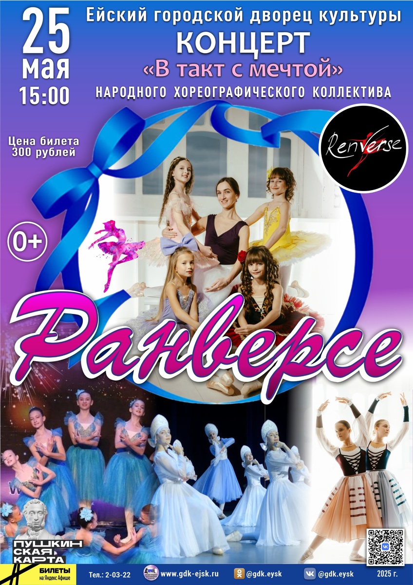 25 мая в 15:00 народный хореографический коллектив «Ранверсе» приглашает вас на свой сольный концерт «В такт мечте» 🩰 Билеты можно приобрести в кассе по адресу: ул. Свердлова, 73/1, а также онлайн Цена: 300₽ На сцену выйдут ВСЕ участники коллектива! От опытных, заслуженных лауреатов всероссийских конкурсов и фестивалей хореографического искусства до самых юных артистов, делающих свои первые, но такие уверенные шаги на большой сцене. ▫ Завораживающие танцевальные номера: откройте для себя мир ярких красок, грации и вдохновения. ▫ Премьеры, которые покорят ваше сердце: станьте первыми зрителями совершенно новых постановок. ▫ Любимые композиции, проверенные временем: насладитесь уже знакомыми и полюбившимися вам композициями. ▫ Особые гости: выступление выпускниц «Ранверсе» и образцового хореографического коллектива «Юнона» станет ярким украшением вечера! В этот замечательный день мы станем на шаг ближе к своей мечте о танце! Не пропустите ❤️