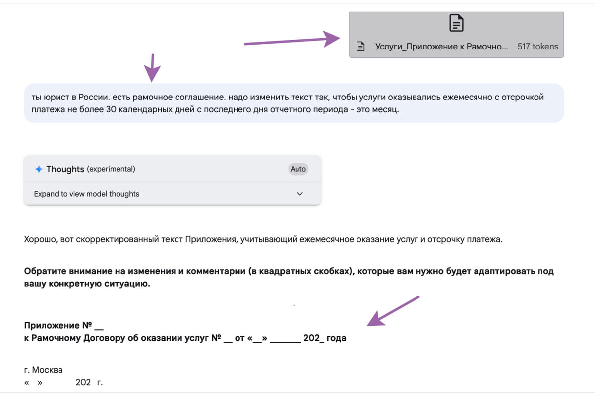 Не все влезло на картинку - мне говорили, что ИИ не заменит юриста и нельзя подменять понятия. Но мы упрямые, как Труфальдино из Бергамо - нам заказчик прислал допик с оплатой услуг за год, взяли его, кинули в Гемини и попросили переписать с оплатой за месяц. И получили готовую редакцию нового соглашения, вполне себе разумную и логичную. А до этого сидели, морщили ум, как изменить формулировки. Мда, юристам хана :) Очень круто выглядит, бесплатно и быстро. Причем ИИ еще расширила допик, детализировала пункты (хоть я не просил). Русский ИТ бизнес