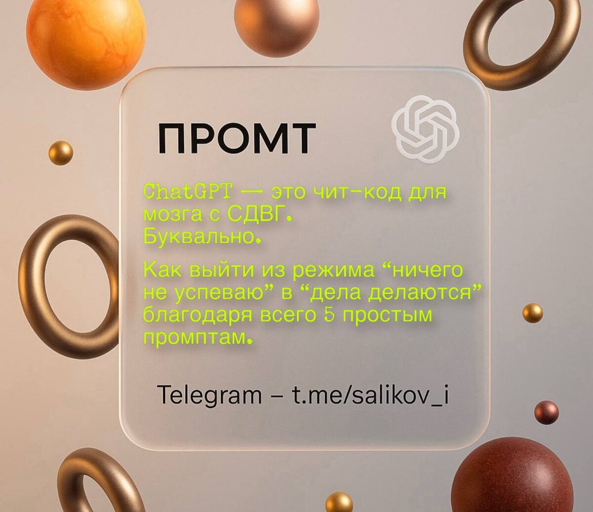 ™️ChatGPT — это чит-код для мозга с СДВГ. Буквально. Как выйти из режима “ничего не успеваю” в “дела делаются” благодаря всего 5 простым промптам. 1/ Генератор микро-задач Разбей вот эту огромную и страшную задачу [ОПИСАНИЕ ЗАДАЧИ] на микро-шаги, каждый из которых занимает меньше 5 минут. Пусть каждый шаг будет конкретным, выполнимым и с чёткой точкой старта. 2/ Расписание-допаминщик Перестрой мои задачи [СПИСОК ЗАДАЧ] в такое расписание, где чередуются интересные и скучные дела, с вкраплением новизны и наград, чтобы поддерживать мотивацию в течение дня. 3/ Усилитель исполнительных функций Помоги мне создать систему принятия решений для [ТИПИЧНАЯ СИТУАЦИЯ], чтобы снизить нагрузку на мозг и не выгорать от бесконечных выборов. 4/ Ловушка прокрастинации: выход Разбери, почему я избегаю [КОНКРЕТНАЯ ЗАДАЧА] — перфекционизм? страх? скука? — и предложи микро-действия, которые обойдут внутреннее сопротивление. 5/ Архитектор фокуса Сконструируй идеальную среду для моего СДВГ-мозга, чтобы