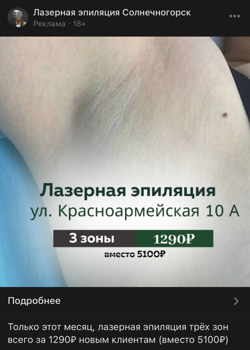 Вот так съездишь пару раз в Солнечногорск, а потом таргет ВКонтакте начинает думать, что ты там живешь и наверняка хочешь сделать лазерную эпиляцию подмышек именно там 😩