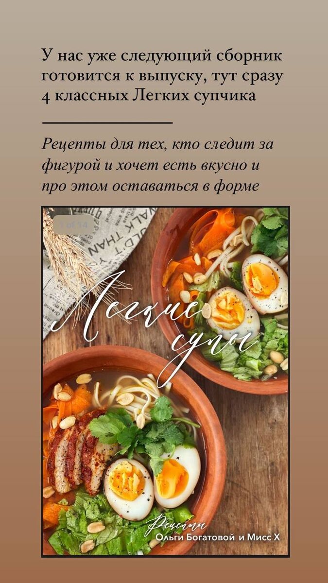 А ещё скоро выйдет сборник Лёгких супов. Все с посчитанной калорийностью, для тех кто следит за фигурой) Продукты доступные, сочетания вкусов интересные и делаются быстро Ждите, скоро будут на сайте❤️