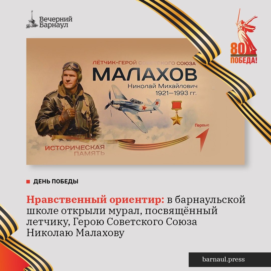 ✈️ В барнаульской школе №132 создали мурал, посвящённый лётчику, Герою Советского Союза Николаю Малахову