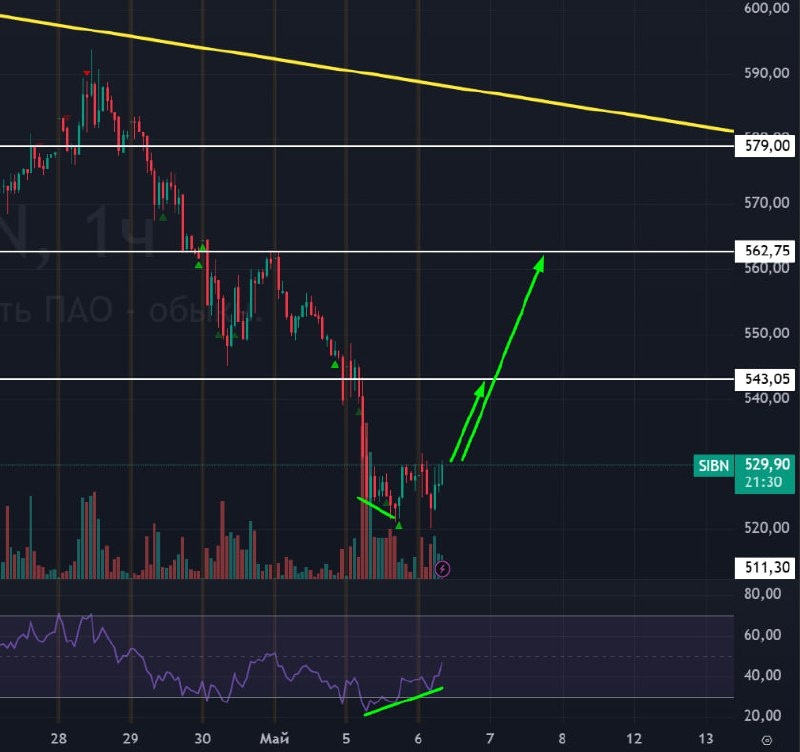 🟢 Сегодня в российском рынке отскок, но на тепловой карте явно отстает от общего позитива газпромнефть. А тут сетап такой же как и в других акциях - конвергенция и ближайшие цели на линиях сопротивления: 543 и 562.