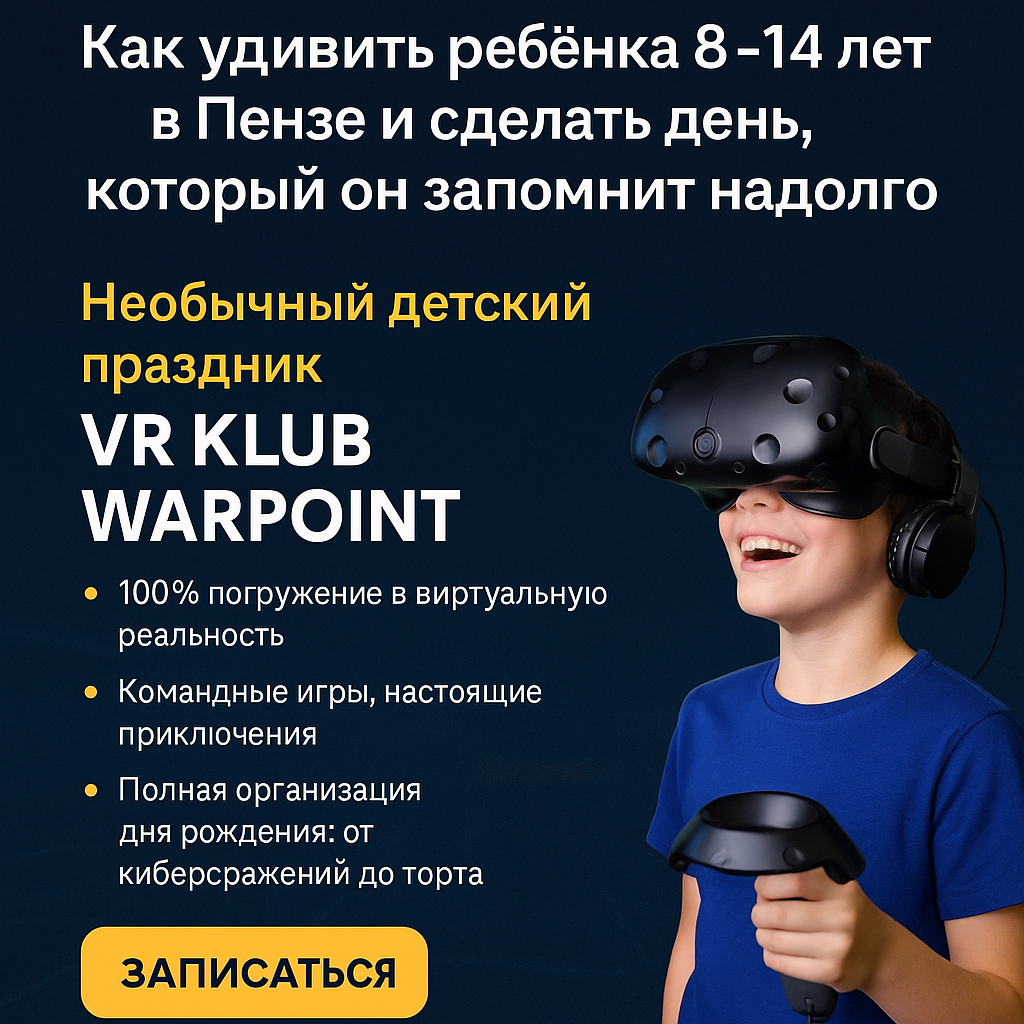 Если вы — мама ребёнка от 8 до 14 лет, то наверняка сталкивались с одной из этих ситуаций: Вы хотите удивить. Хотите, чтобы глаза ребёнка загорелись. Чтобы он потом говорил: “Это был самый крутой день!” Добро пожаловать в WARPOINT VR — клуб виртуальной реальности в Пензе, где дети не просто играют, а погружаются в другой мир. Это не компьютер и не очередной батутный центр. Это новый уровень детского досуга, после которого даже самый “цифровой” ребёнок говорит: “Вау!” Это высокотехнологичная арена виртуальной реальности, где дети: 📍 В Пензе мы находимся по двум адресам — удобно добраться из любой части города. Мы превращаем обычный день в приключение, о котором рассказывают в школе. От киберсражений до космических миссий — ребёнок становится героем. VR-оборудование профессионального уровня, гигиена на 100%, чёткий инструктаж. Для мам — отдельная лаундж-зона, где можно отдохнуть и понаблюдать. Организуем день рождения под ключ: стол, торт, напитки, подарки, фотозона. Можно просто прийти