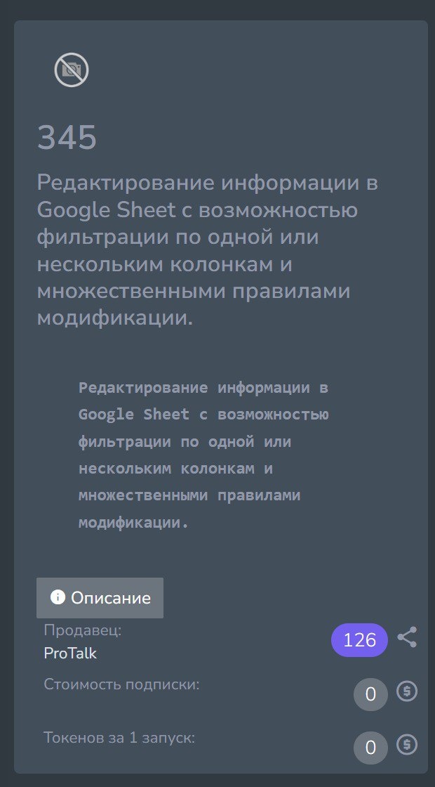Автоматизируйте работу с Google Таблицами через ProTalk! Теперь в ProTalk доступна мощная функция google_edit_sheet — она позволяет гибко редактировать данные в Google Sheets с поддержкой сложной фильтрации и множественных правил изменений. Что умеет? ✅ Фильтрация данных по одному или нескольким условиям (включая AND/OR). ✅ Разные операции с ячейками: setValue — установить новое значение, add — прибавить число, multiply — умножить, replace — заменить старое значение на новое. ✅ Работа с любыми колонками — текстовыми, числовыми, списками. ✅ Поддержка сложных сценариев: - Обновление цен в каталоге, - Корректировка статусов заказов, - Массовое исправление данных. Пример формирования параметров функции: { "sheet_url": "https://docs.google.com/spreadsheets/d/XXXXXXXXXXXXXXX/edit?usp=sharing", "worksheet_name": "Лист1", "filter_criteria": [ { "logical_operator": "AND", "conditions": [ {"column": "ID чата телеграм", "operator": "=", "value": 410000000}, {"column": "Название урока", "oper