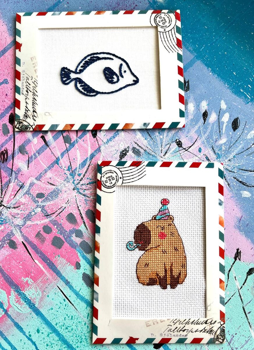 Настроение - делать открытки из подручных материалов 🌠🌅 Капибара отправится в Питер. Рыбка пока свободна. #belka_рукодельница #вышивкакрестом #рисуюиглой #шовчики