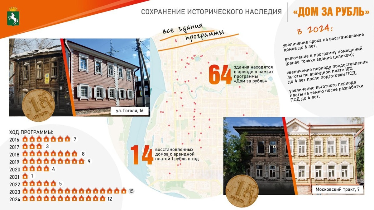 Более 60 исторических домов вовлекли в программу аренды за рубль в Томске В 2024 году в Томске удалось завершить восстановление семи исторических домов, сданных по программе «Дом за рубль». Столько же домов, по данным мэрии, было восстановлено за все предыдущие годы. Сейчас для 14 домов в Томске введена арендная плата размером в один рубль. Всего в программе участвуют 64 объекта, из которых 12 были включены в нее в 2024 году. «На позитивной динамике реализации программы сказались дополнительные меры поддержки инвесторов, которые мы приняли совместно с депутатами. В следующем году программе „Дом за рубль“ исполнится 10 лет. К юбилею есть намерение издать фотоальбом с рассказом и показом восстановленных домов и участников этого проекта. Этим проектом мы по праву можем гордиться и — заверяю — будем делать все для его дальнейшего развития», — сказал Дмитрий Махиня. Что такое «Дом за рубль» Администрация Томска предлагает потенциальным инвесторам за свой счет отремонтировать дома-памят