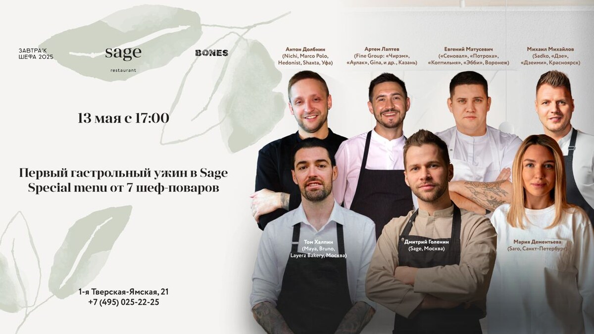 Большой ужин в Sage 13 мая, 17:00 По случаю выхода нового номера журнала Bones в Sage собирается большая, разношерстная и очень классная компания: Мария Дементьева из петербургского Saro, Антон Долбнин из уфимских Nichi и Marco Polo, Артем Лаптев из «Чирэма» и «Аулака» в Казани, участник прошлогодней «Соли Земли» Евгений Матусевич, шеф «Сеновала» и «Потрохов» в Воронеже, красноярец Михаил Михайлов (Sadko, «Дзе», «Дзеими») и москвичи Том Халпин из Maya и Layerz Bakery и гостепреимный хозяин Дмитрий Голенин. Каждый, конечно, со своими продуктами и вкусами (среди ингредиентов я разглядел башкирский каймак, беломорские мидии, воронежскую спаржу и татарскую конину). Готовят не сетом, а по меню, так что выбирайте сами, что пробовать. Бронь: +74950252225 🗺 Sage 1-я Тверская-Ямская, 21 🧂 @saltmagazine