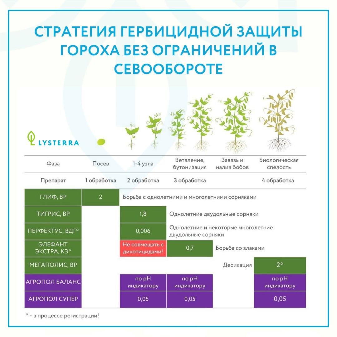 Эффективная гербицидная стратегия в горохе: контроль сорняков как основа урожайности Контроль сорняков — ключевой фактор в технологии возделывания гороха. Своевременное применение гербицидов позволяет снизить конкуренцию за свет, влагу и элементы питания, а также минимизировать потери урожая от засорения. В зависимости от севооборота, наша компания предлагает две схемы защиты с проверенными решениями. 1. Для посевов без ограничений в севообороте: 🔹 Глиф, ВР (глифосат (калийная соль) 540 г/л) — 2 л/га до посева для борьбы с однолетними и многолетними сорняками; 🔹 Тигрис, ВР (бентазон 480 г/л) — 1,8 л/га в фазу 1–4 узлов против однолетних двудольных сорняков; 🔹 Элефант Экстра, КЭ* (клетодим, 360 г/л) — 0,7 л/га в фазу ветвления и бутонизации для борьбы со злаковыми сорняками. Препарат не рекомендуется совмещать с дикотицидами; 🔹 Мегаполис, ВР* (глюфосинат аммония 150 г/л) — 2 л/га в фазу биологической спелости для десикации культуры. Дополнительно: 🔹 Агропол Баланс — для коррекции p