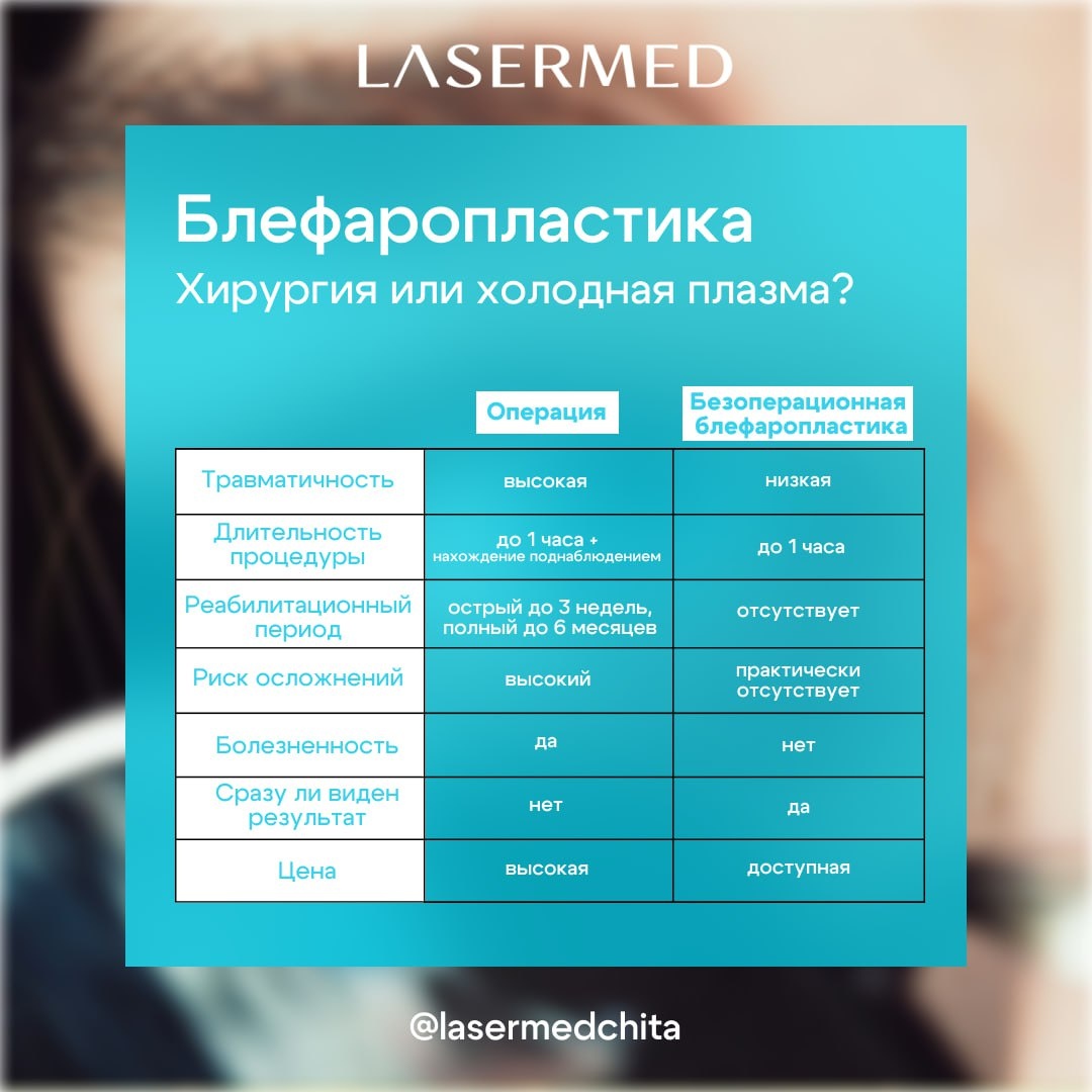 Что делать с нависающим веком? #АкцииЛазермед Нависшее верхнее веко — распространенная эстетическая проблема, которая делает взгляд усталым, прибавляет возраст и может ухудшать зрение. Решением вопроса традиционно считается пластика век — блефаропластика. ❗️ Но теперь есть и более приятная альтернатива, без скальпеля хирурга. Клиника LASERMED предлагает уникальную процедуру — безоперационную блефаропластику с использованием современной технологии холодной плазмы на аппарате ЭХВЧ-35 Plasma L. Этот метод позволяет добиться заметного эффекта подтяжки кожи вокруг глаз всего за две процедуры! И самое приятное — стоимость курса снижена специально для наших пациентов: всего 14 000 рублей вместо 18 000 за оба сеанса. 🌟 Холодная плазма стимулирует регенерацию клеток кожи, улучшает её структуру и повышает эластичность, и это способствует выраженному омоложению и подтяжке зоны вокруг глаз. В таблице мы сделали сравнение этих методик. 🩵 Выбирайте лучшее для себя! А опытные врачи клиники