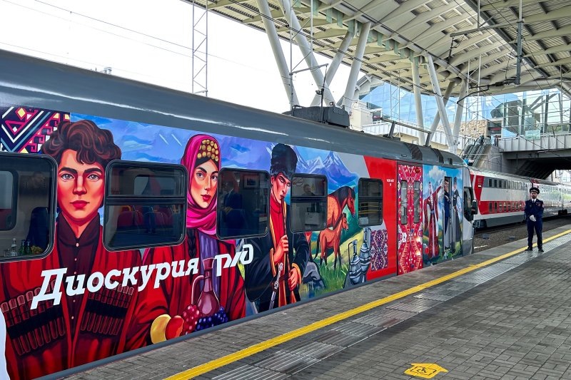 В 2025 году электропоезд "Диоскурия", курсирующий между федеральной территорией "Сириус" (бывший "Имеретинский курорт") и Сухумом, стал настоящей визитной карточкой российско-абхазского туризма. Его вагоны украшены яркими росписями, созданными по лучшим эскизам российских и абхазских художников. 🔹 Почему "Диоскурия"?