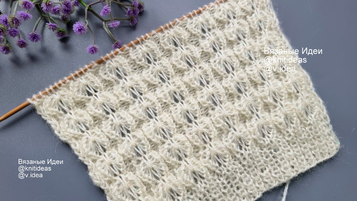 Приветствую Вас на канале Вязаные Идеи! Сегодня рассмотрим очень красивый узор спицами на основе резинки. Вяжется этот узор не сложно, схема простая. Образец связан из пряжи Alize Angora Gold Simli, спицы №3 Раппорт 5 петель и 8 рядов Внимание! При копировании и публикации моих материалов на других ресурсах указывайте активную ссылку на источник: канал Вязаные Идеи Вязание поворотными рядами: Количество петель кратно 5 +2 + 2 кром Подготовительный ряд: кром, 2 лиц, *3 изн, 2 лиц*, кром 1,3,5 ряд: кром, *2 изн, 3 лиц*, 2 изн, кром 2 ряд и все четные ряды: кром, 2 лиц, *3 изн, 2 лиц*, кром 7 ряд: кром, *2 изн, 1 лиц, спустить 6 петель, провязать петлю лицевой, подхватив протяжки, 1 лиц*, 2 изн, кром 8 ряд: кром, 2 лиц, *3 изн, 2 лиц*, кром Повторять узор с 1 по 8 ряд Можно вязать его и круговыми рядами. Количество петель кратно 5 Подготовительный ряд: *2 изн, 3 лиц* 1 - 6, 8 ряд: *2 изн, 3 лиц* 7 ряд: *2 изн, 1 лиц, спустить 6 петель, провязать петлю лицевой, подхватив протяжки, 1 лиц*