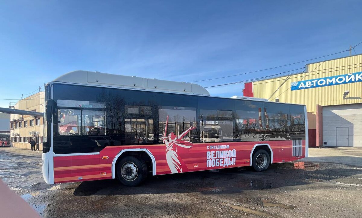 Перевозчик „Домтрансавто“ забрендировал автобусы символикой „С днем Победы“ и скульптурой „Родина мать зовет“. Они будут ездить по городу с флагами-знаменами в честь Дня Великой Победы и портретами „Бессмертного полка“, которые прислали горожане.