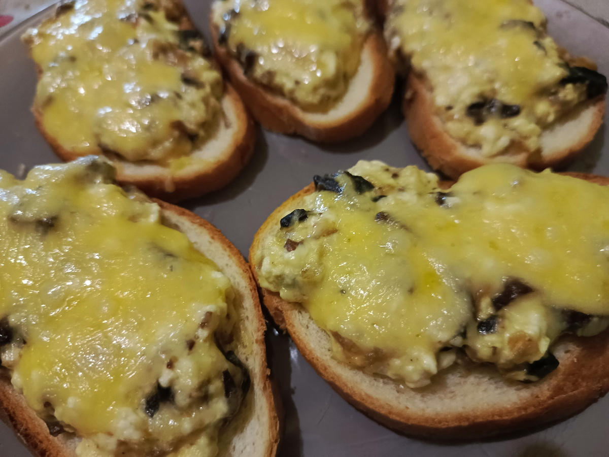 Батон нарезаем на ломтики. Начинка: режем шампиньоны и репчатый лук кубиками и обжариваем. Даем немного остыть. Добавляем творог, разбиваем сырое яйцо, солим и перчим по вкусу. Все перемешиваем. Каждый ломтик выкладываем на противень и выкладываем начинку. Сверху посыпаем тертым сыром. Ставим в духовку на 10-15 минут.