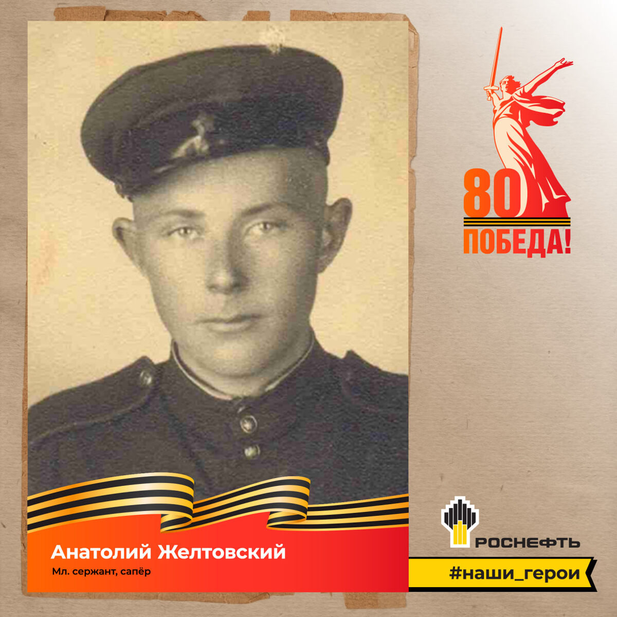 На фото — Анатолий Константинович Желтовский, младший сержант, ветеран войны. Призван в армию в 1942 году. После подготовки в Омске был направлен в Новосибирск на курсы сержантского состава. Получил звание младшего сержанта. В 1943 году Анатолия Константиновича направили на фронт. Сначала он был зачислен в артиллерийский истребительно-противотанковый полк, затем переведен в отделение разведки, потом в сапёрные войска, в которых он прослужил до конца войны. Дядю вспоминает наша коллега Вера Шангина: «Служил на Северо-западном фронте под командованием генерала армии Конева. В сапёрных войсках «ставил» мины для обороны армии, занимался разминированием полей, наведением понтонных мостов, делал переправы, прокладывал дороги через болота, труднопроходимые места, создавая условия для продвижения советских войск». Конец войны Анатолий Константинович встретил в Прибалтике 8 мая: «Наступила тишина, перестали летать самолёты, не стало слышно выстрелов. Поняли, что кончилась война, радости не было