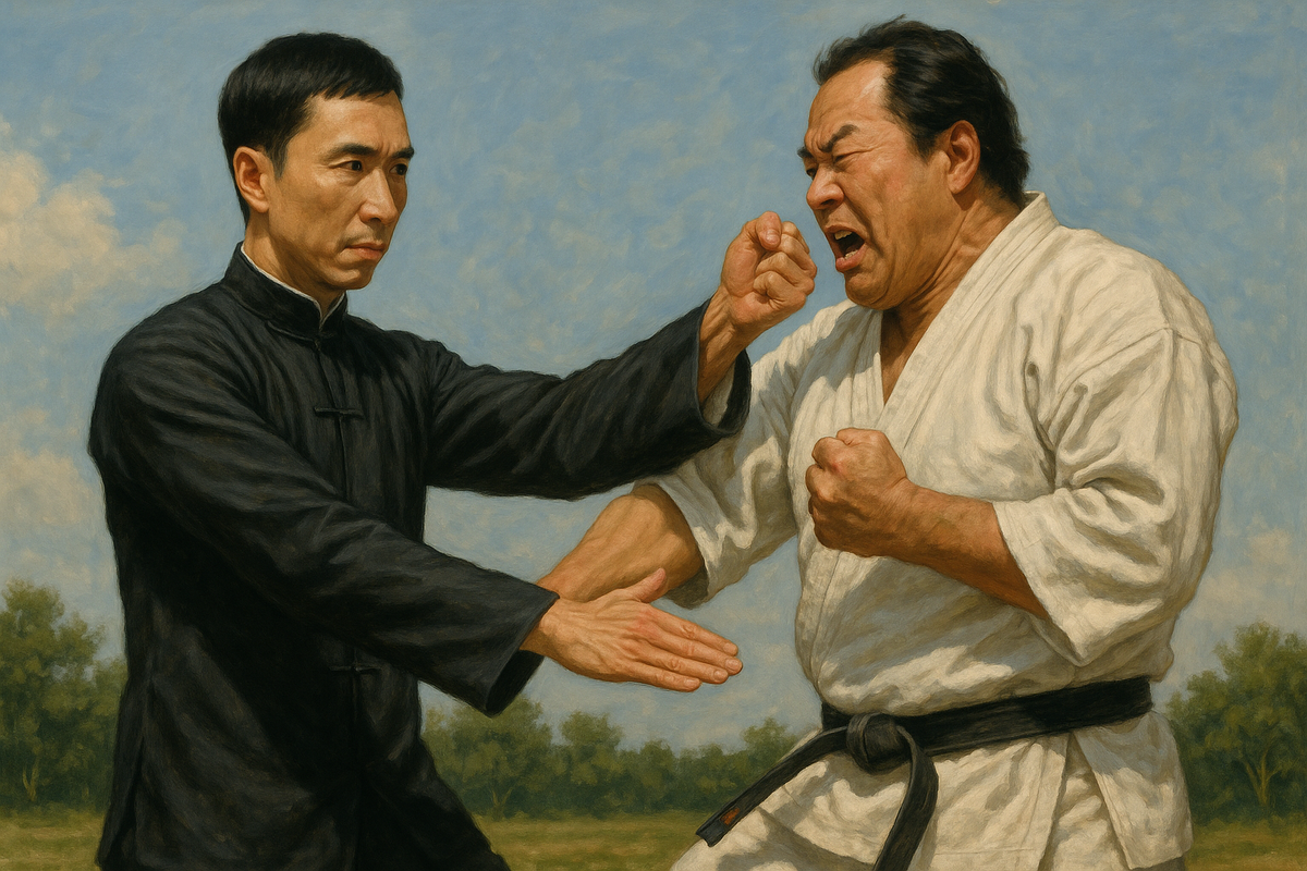 Это противостояние уходит корнями в глубь истории восточных единоборств. Адепты карате, воспитанные на принципах жёстких, угловатых движений, сконцентрированной силы в точке удара и философии "иккэн хиссацу" (одним ударом наповал), часто смотрят на кунг-фу как на нечто излишне витиеватое, эстетичное, но лишённое практической ценности в условиях реального боя. В их глазах замысловатые стойки, плавные переходы и акробатические элементы кунг-фу – всего лишь красивая обертка, скрывающая отсутствие настоящего "ударного стержня". Они с сарказмом говорят о "журавлиных клювах" и "пьяных обезьянах", противопоставляя им свой сокрушительный гяку-цуки и маваши-гери, способные, по их мнению, мгновенно отправить противника в царство теней.