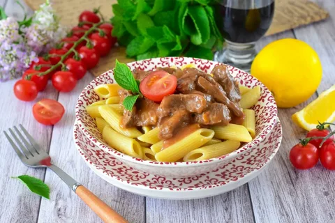 Макароны с мясом и подливой - вкусное и сытное повседневное блюдо. Готовить его просто и быстро из доступных ингредиентов. Ингредиенты: Макароны (пенне, ракушки) - 300 гр. Соль - по вкусу Подливка: Соль - по вкусу Говядина - 400 гр. Мясной бульон (или вода) - 750 мл Лавровый лист - 2 шт. Томатная паста - 2 ст. л. Пшеничная мука - 1 ст. л. Петрушка - по вкусу Перец черный молотый - по вкусу Рецепт приготовления