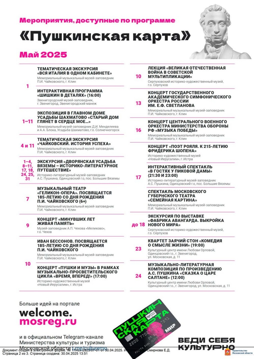 Перечень мероприятий, доступных к посещению в рамках Программы «Пушкинская карта» в мае 2025 года