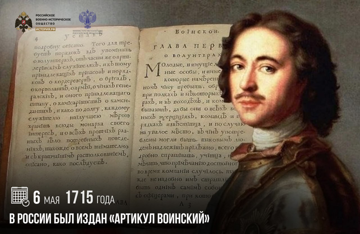 Он стал первым документом в России, регламентирующим ответственность солдат и офицеров за совершение преступлений, и состоял из 24 глав, разделенных на 209 артикулов, то есть статей. Согласно «Артикулу воинскому», преступлением являлось общественно опасное деяние, причинившее вред государству. Через год, 10 апреля 1716-го, «Артикул воинский» стал второй частью в Воинском уставе Петра I и действовал вплоть до правления императора Николая I (https://rutube.ru/video/5853d12e7d810bed12f9dc6aba96feea/), когда 13 января 1835 года был издан манифест о введении «Свода законов Российской империи». #памятныедаты_ИсторияРФ Подписаться на История.РФ
