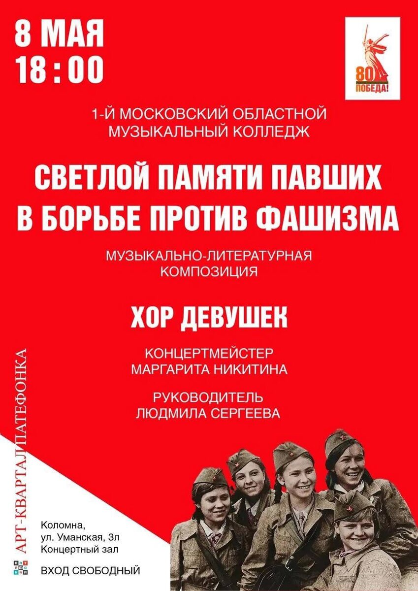 🚩Друзья! Началась неделя Победы! И в этот четверг, 8 мая в 18.00 мы приглашаем вас посетить концертный зал Арт-Квартала «Патефонка», чтобы услышать музыкально-литературную композицию «Светлой памяти павших в борьбе против фашизма» в исполнении прекрасного Хора девушек 1-го Московского областного музыкального колледжа г. Коломна. Данная композиция - это не только творческое высказывание, но и глубокая благодарность тем, кто защитил мир, сохранил нашу культуру и подарил нам будущее. Музыка и слово сольются воедино, чтобы рассказать историю о мужестве, стойкости и вере. 🎶 Мы хотим, чтобы эти моменты стали не просто воспоминанием, а напоминанием: мир, который мы ценим сегодня, — это результат подвига тех, кто остался навсегда на полях сражений. Пусть этот день станет для всех нас вдохновением и энергией для сохранения исторической памяти и преемственности поколений! ⏰ 8 мая (четверг) в 18.00 📍Арт-квартал "Патефонка", г. Коломна, ул. Уманская, 3Л, концертный зал. Вход свободный! Тел
