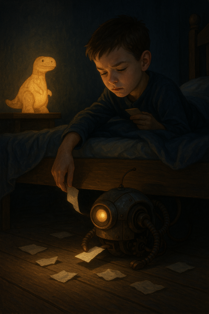 Он придумал, что под кроватью живёт не монстр, а машина, которая ест страхи. Каждую ночь он пишет свой страх на бумажке и “кормит” её.