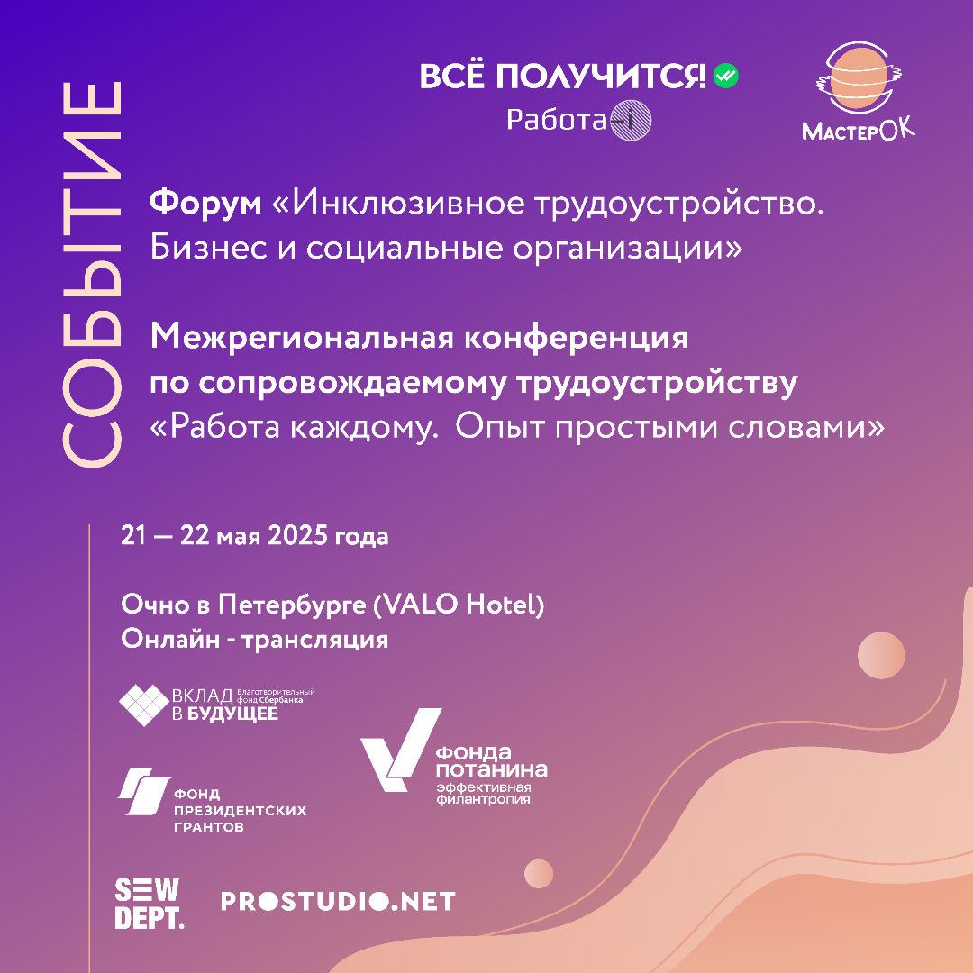социальные организации» и Межрегиональную конференцию по сопровождаемому трудоустройству «Работа каждому. Опыт простыми словами». *Участие бесплатное. Количество очных мест ограничено. Регистрация на мероприятие обязательна: