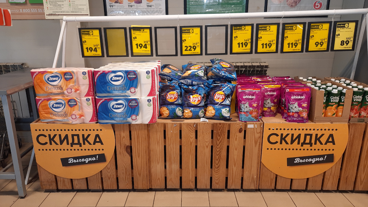 Всех приветствую, мои дорогие друзья, подписчики и гости моего канала.В Пятерочке началась новая неделя скидок. Покажу вам витрину с товарами со скидкой и товары у кассы. Магазин находится по адресу Ростовская область, Зерноградский район, станица Мечётинская, улица Ленина, 62. Неделя скидок продлится с 6 до 12 мая 2025 года. Туалетная бумага Зева 3х-слойная, 8 рулонов, в ассортименте цена со скидкой по карте 194.90 руб. Чипсы картофельные Лейс 225 г сметана и зелень цена со скидкой по карте 229.99 руб. Корм Вискас сухой полнорационный с говядиной для стерилизованных кошек 350 г цена со скидкой по карте 119.99 руб. Корм Вискас сухой Вкусные подушечки курица/индейка для взрослых кошек 350 г цена со скидкой по карте 119.99 руб. Корм Вискас Вкусные подушечки 350 г говядина для кошек цена со скидкой по карте 119.99 руб. Сок Global Village томатный восстановленный с мякотью и солью 0.95 л цена со скидкой по карте 89.99 руб. Нектар Global Village апельсиновый 0.95 л цена со скидкой по