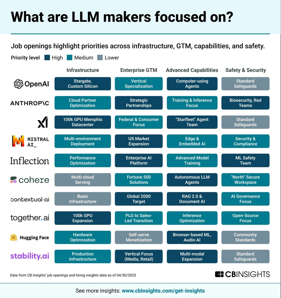По инфографике CBInsights можно отследить, на что ставят бигтехи и куда они высокоприоритетно инвестируют в ИИ-проекты ⚫️Мультимодальность — новый отраслевой стандарт: текст + видео + аудио + изображения. У 6 из 10. ⚫️Корпоративный GTM (go-to-market): расширение команд по продажам и поддержке для монетизации решений на корпоративном уровне. У 5 из 10. ⚫️Разработка ИИ-агентов — у 5 из 10. ⚫️Инвестиции в инфраструктуру: крупные компании строят мощные дата-центры и закупают GPU, чтобы не отставать от Маска😁 У 3 из 10. ⚫️Безопасность: рост спроса на специалистов по LLM Security, создание центров компетенций по безопасности ИИ из-за рисков и угроз. У 2 из 10.