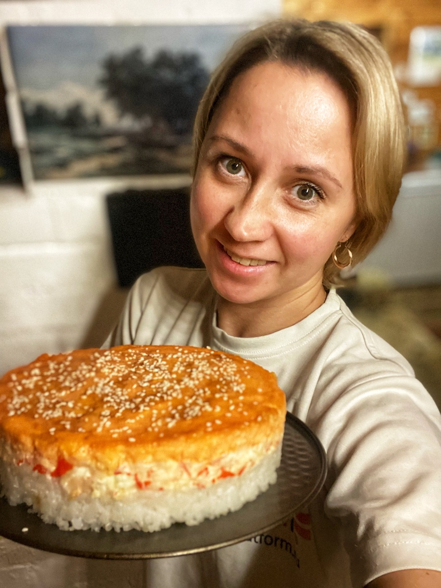 🍴Вкусный вторник Не было сильных ожиданий от данного блюда, а по факту - пальчики оближешь 😋 В следующий раз попробую сразу порционно приготовить, одним словом эксперименты продолжаются 😎 Ингредиенты: Для основы: - 200 гр., риса для суши - 400 мл., воды Для начинки: - 200 гр., крабовых палочек - 150 гр., творожного сыра - майонез Для сырной шапочки: -банка икры с копченым лососем -100 гр., твердого сыра -майонез Для украшения: -соус терияки -кунжут -листы нори Приготовление: 1. Промойте рис под холодной водой до прозрачности. В кастрюле смешайте рис и воду, доведите до кипения, затем уменьшите огонь и готовьте под крышкой 15-20 минут, до готовности. 2. Приготовление начинки: Крабовые палочки разорвите на волокна с помощью вилки. Добавьте творожный сыр и майонез. Перемешайте до однородной массы. 3. Приготовление сырной шапочки: в миске смешайте натёртый сыр, копченую икру и майонез. Перемешать до однородной массы. 4. Собираем торт: первый слой - рис, сверху выкладывае