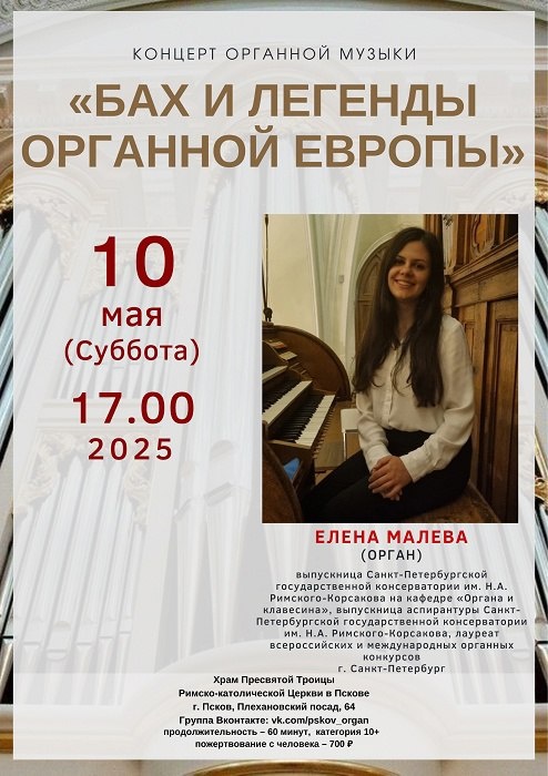 🎼 Концерт «Бах и легенды органной Европы» На концерте выступит талантливая петербуржская органистка Елена Малева — выпускница Санкт-Петербургской консерватории им. Н.А. Римского-Корсакова, лауреат конкурсов. 📜 В программе — органные произведения XVII–XX веков: Люлли, Маршан, Муффат, Бах, Райнбергер, Вьерн, Гильман. 🎟 Вход по пригласительным за пожертвование. Концерт для всех старше 10 лет, 60 минут без антракта. В начале — художественное слово. 📆 10 мая в 17.00 📍 В храме Пресвятой Троицы Римско-католической Церкви По вопросам концертов обращаться по телефонам: (8112) 62-13-50; +7 (911) 968-63-32 и +7(911) 209-59-53. Оставайтесь с нами #НашаПсковскаяобласть #концерт