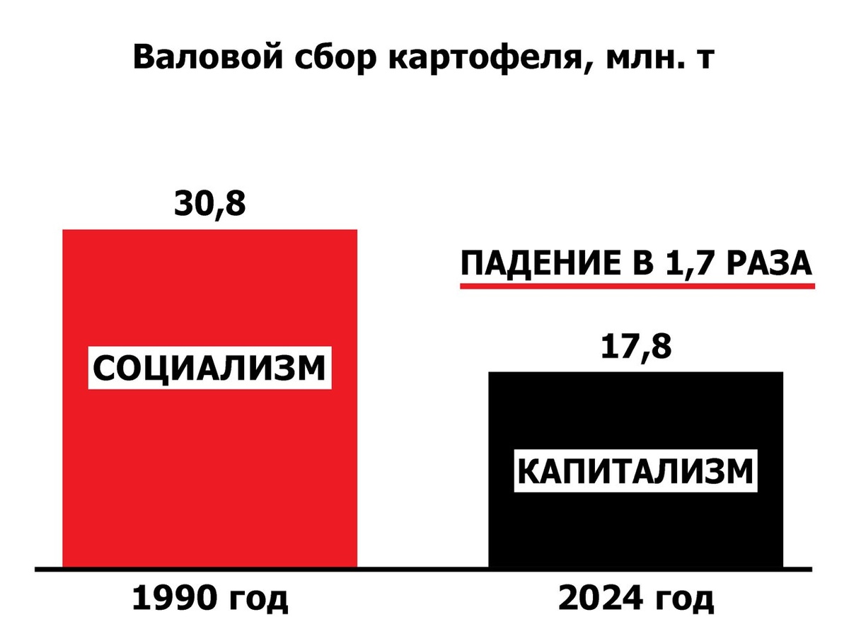 Как же капитализму удалось сделать из картошки предмет роскоши? Сегодня «Коммерсант» сообщил, что только с начала года оптовая цена на картофель в России выросла почти вдвое (на 85%) и достигла 46 руб. за 1 кг. А в сравнении с прошлой весной оптовые цены увеличились аж в 4,4 раза! Вслед за оптовиками задирает цену и розничная торговля: сейчас цены уже в 2,8 раза выше, чем весной 2024-го – порядка 85 руб. за кг. И по динамике оптовых цен понятно, что это не предел. Кстати, обратите внимание, что розничная наценка составляет около 50% цены картошки на прилавках. Официальная версия дикого скачка цен на картошку – плохая погода и, соответственно, плохой урожай прошлого года. Но в реальности в 2024 году урожай был всего на 12% меньше, чем в 2023-м. А вот цены выросли в 3-4 раза. Суть в дела в другом: в последние годы сбор картофеля в России стабильно примерно в 2 раза меньше, чем в РСФСР 1980-х годов. Недостаток покрывается массовым ввозом картошки из Египта, Израиля, Пакистана и т. д. При