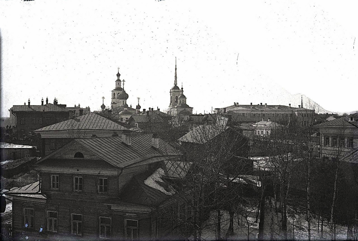 Этот снимок начала 1900-х годов сделан из окна здания мужской гимназии, где сейчас размещается вологодский государственный университет, в сторону современной площади Революции. Слева это Спасо-Всеградский собор, а справа - церковь Николая Чудотворца на Сенной. Однако, нас сегодня интересует ближний домик слева в кадре.