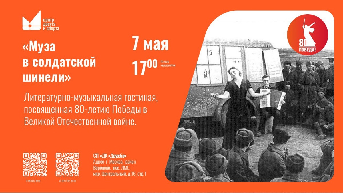 7 мая в 17:00 приглашаем вас в ДК "Дружба" на литературно-музыкальную гостиную «Муза в солдатской шинели», посвященную 80-летию Победы в