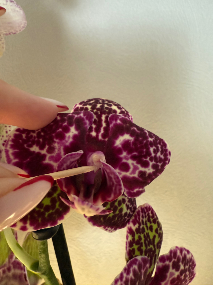 Когда-то я задалась желанием вырастить орхидеи из семян. Мне было крайне интересно, как это сделать. Для начала нужно как-то добыть семена, а для этого нам понадобится две орхидеи или два цветка на одном растении. Лично мне было неинтересно опылять орхидею саму на себя. Поэтому для первого раза я выбрала Будду (как отца) и белую орху (как материнское растение). Из правил, что мне известны: Давайте по шагам разберём, как опылить орхидею. В этот раз буду опылять Дикого кота на Клеопатру. 1) Из носика орхидеи торчит маленький липкий язычок, нам нужно подцепить его зубочисткой с обратной стороны (см. фото). Он довольно легко подцепляется. 2) На зубочистке должна оказаться пыльца (см. фото) 3) С этой пыльцы необходимо снять белую оболочку, так, чтобы на зубочистке осталась пыльца на липком язычке. Я аккуратно ногтем убрала белую оболочку (можно себе помочь это сделать зубочисткой). Получается вот такой результат. 4) Данную пыльцу необходимо засунуть в носик цветочка, который будет