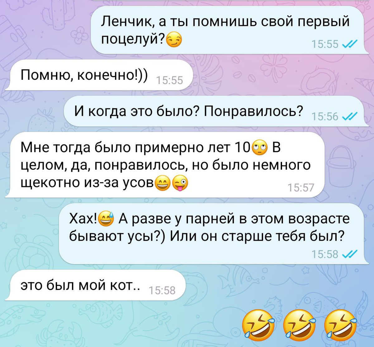 Мечта любой девушки - иметь лучшую подругу, с которой можно поделиться всеми своими секретами, обсудить отношения с парнями, да и просто вместе посмеяться над всякой ерундой. В сегодняшней подборке вы найдёте 7 смешных переписок из мессенджеров и убедитесь в том, что с подругой, какой бы она не была, всегда веселее и вообще никогда не приходится скучать. Одним из самых запоминающихся моментов в жизни любого человека является первый поцелуй. Многие помнят его вплоть до глубокой старости. Но кто сказал, что он обязательно должен быть с человеком?) Некоторые девушки и женщины очень любят использовать такой вид манипуляций в отношениях, как обида, чтобы вызвать у партнёра чувство вины и заставить его признать свою неправоту, даже если по факту он был прав. Однако не всегда всё идёт по плану, особенно если у тебя плохая память. Как когда-то написал Александр Сергеевич Пушкин: "Любви все возрасты покорны". Сложно не согласиться с цитатой великого русского поэта, но только если речь не идёт