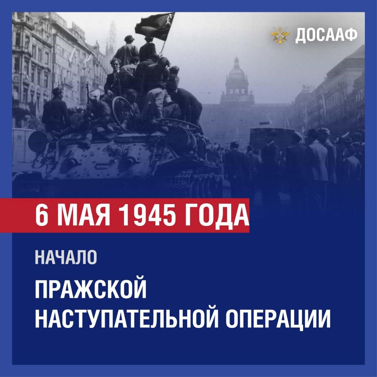 6 мая 1945 года – начало Пражской наступательной операции В завершающие дни Великой Отечественной войны советские войска провели Пражскую наступательную операцию. Силами 1-го, 2-го и 4-го Украинских фронтов при поддержке польских, румынских и чехословацких войсковых соединений, входивших в состав фронтов, была разгромлена последняя крупная группировка вермахта в Европе. Операция, проведённая в период с 6 по 11 мая 1945 года, отличалась высоким уровнем военного мастерства и стремительностью наступления. Советские танковые соединения преодолели за сутки 80 км, что позволило предотвратить разрушение исторического центра Праги и спасти жизни десятков тысяч мирных жителей. В результате Пражской операции было взято в плен порядка 860 тыс. нацистских солдат и офицеров, 60 генералов. Подписывайтесь на Telegram-канал «ДОСААФ России» #ДОСААФ #ПатриотическоеВоспитание #Победа #ИсторическаяПамять