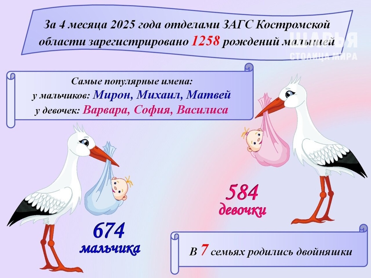 В Костромской области родилось за 4 месяца уже 1258 детишек. С 1 января по 30 апреля в нашем регионе появилось свыше тысячи новых жителей, причем в 7 семьях родились двойняшки. Мальчишки продолжают тенденцию превосходства в количестве над девчатами. Новорожденных мальчиков почти на сотню больше девочек. Будущих мужчин называют чаще всего Мироном, Михаилом или Матвеем - сразу видно родителям нравятся звучные имена. Девочек называют такими именами, как Варвара, Василиса и София. Красивое звучание женских имен тоже радует своей мелодичностью. Шарья – столица мира Крупнейшее городское СМИ Источник