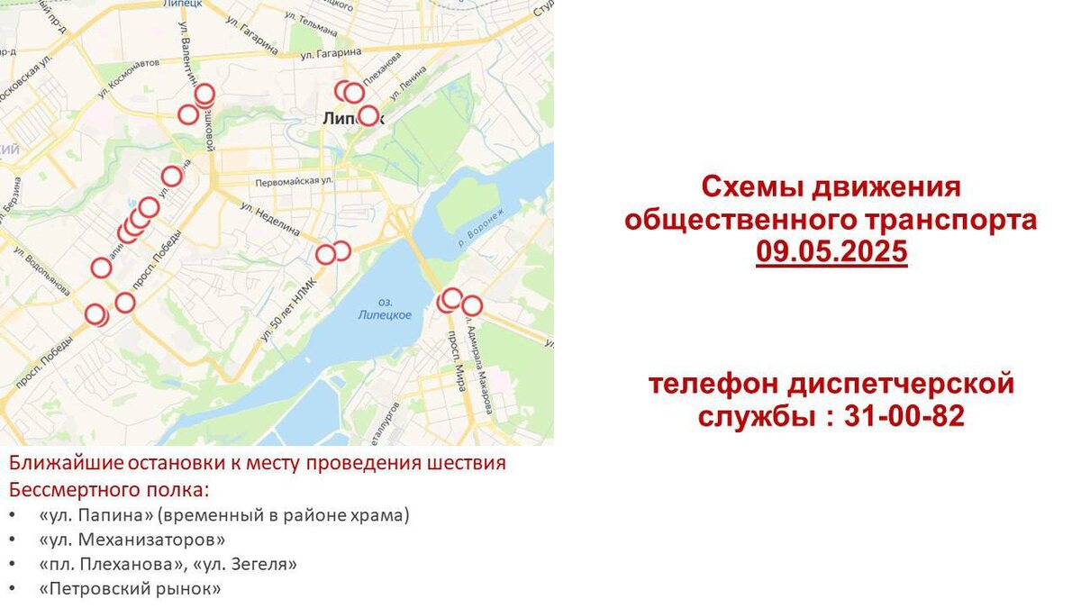 В связи с празднованием 9 мая также изменится схема движения общественного транспорта 🚌 Одним из ключевых событий станет шествие «Бессмертного полка» — долгожданная акция, к которой готовились многие липчане. ⬆️Ближайшие остановки к маршруту шествия указаны в карточке выше. ⬇️Актуальная схема движения транспорта на 9 мая будет доступна ниже.