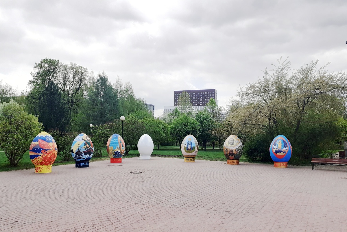 В этом году десятилетие фестиваля "Пасхальный Дар", он проводится с 2015 года. Я посетила фестивальную площадку в усадьбе Свиблово. Там на территории стоит храм Пресвятой Троицы, а вокруг него достаточно места, чтобы разместить пасхальные арт-объекты. Этот год, 2025-й, объявлен Годом защитника Отечества и 80-летия Победы. Поэтому тема для росписи пасхальных двухметровых яиц была выбрана заранее. В фестивале на площадке в Свиблово принимали участие юные учащиеся московских школ искусств. Тема Защиты Отечества и Русских святых воинов широко представлена в оформлении пятнадцати экспонатов выставки на прихрамовой территории. Честно говоря, я, когда зашла, ахнула. Какая необычная локация! И сразу побежала смотреть и печатлеть на память для потомков или просто для тех, кто в этом году не увидел эту площадку. Снизу, на основании яиц, подписано, из какой школы ученики это творили. Вот тема Куликовской битвы. Древо со святыми воинами. Галерея на боковой дорожке. Русский флот 19 века. Святой Фео