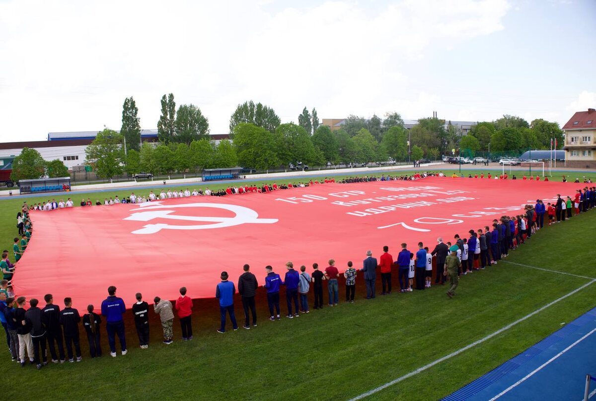 🔥В рамках открытия мероприятия состоялся финиш краевого автопробега «Эх, путь-дорожка, фронтовая…». Также участники и зрители матча развернули на футбольном поле гигантскую копию Знамени Победы.