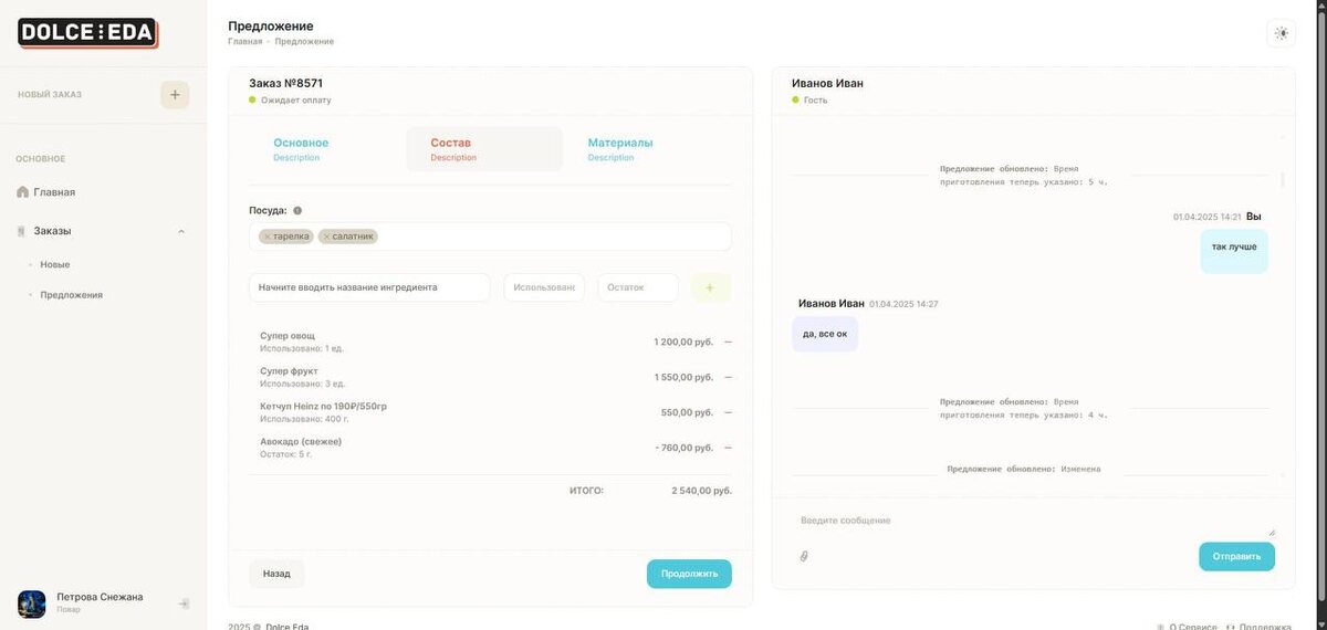 Есть «мамы», которые нуждаются сейчас в поддержке. И мы ее окажем. Есть «мамы» уже адаптировались к жизни с ребенком, и хотят зарабатывать в декрете. Поэтому Долчье Еда 2.0 еще удобнее даст возможность. Каждый повар сам будет устанавливать стоимость своего часа. Для клиентов цена будет ниже. 🔥на выходе! А скрин, уже с нового личного кабинета Повара. Мы пишем свой собственный код. Потому что наша идея уникальная!