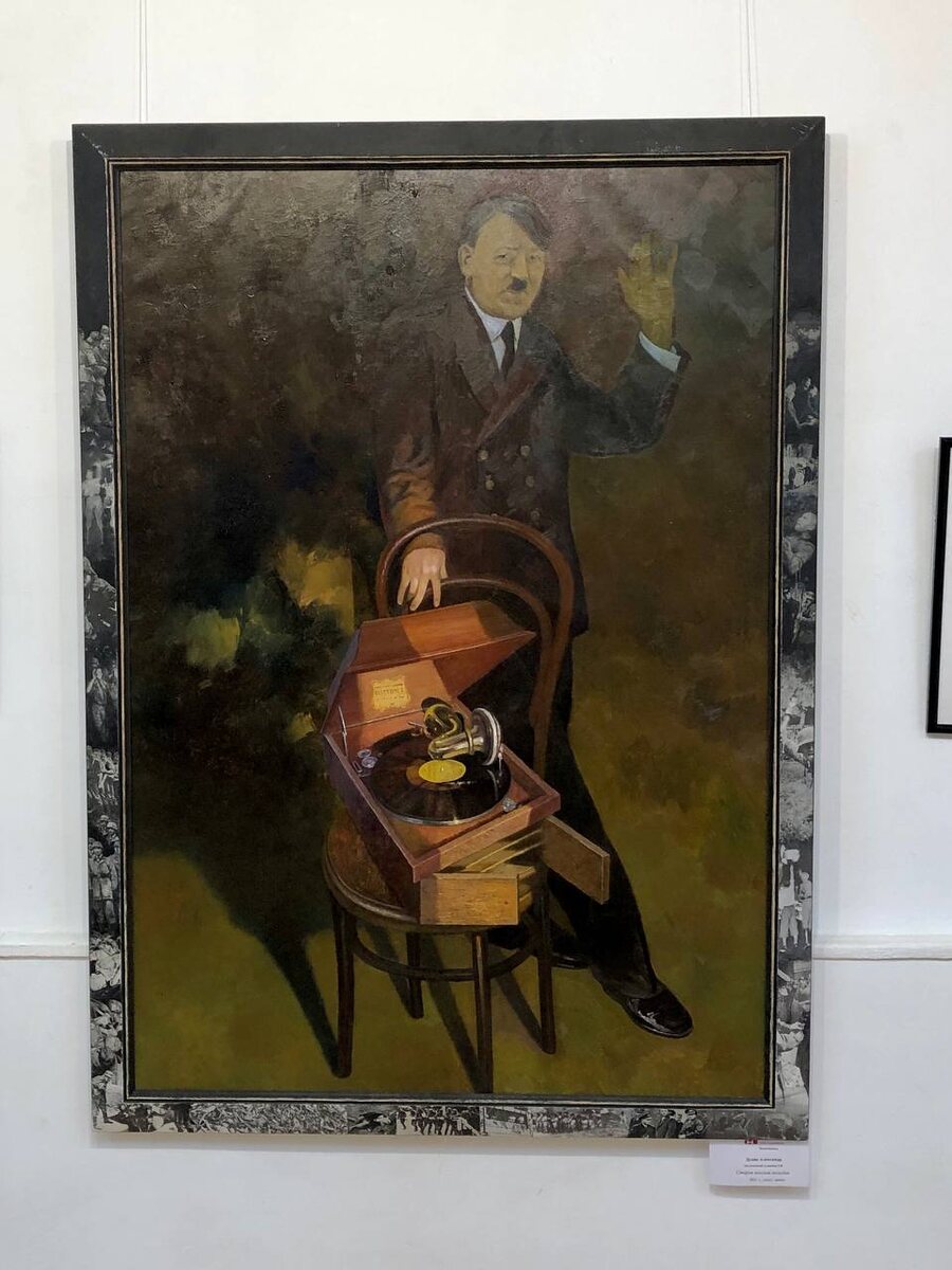 Леденящая душу картина в галерее «Реутов» «Старинная венская мелодия», Александр Дудин 2021 Персональная выставка художника «Защитникам отечества посвящается» продлится по 24 мая. В экспозиции представлены иллюстрации, посвященные боевому подвигу советских солдат, окопы, ранения, баталии. Полотно «Старинная венская мелодия» чудовищной доминантой созерцает все те ужасы, что натворил изображенный на ней улыбающийся Адольф Гитлер. Не все посетители способны созерцать эту картину. На открытии выставки пожилая дама, даже не стала разбираться, а мельком взглянув на полотно сразу покинула зал. Не уверена, что художник видел эту сцену, но прокомментировал, что изображения преступлений правления Гитлера разместил на раме по боковым и нижней стороне картины специально, чтобы расставить акценты. Какое на вас произвело впечатление это полотно? Размышляю, осмелилась ли бы я на такую провокацию и прихожу к мнению, что однозначно нет. Даже смелый автор по окончанию торжественной части выдохну
