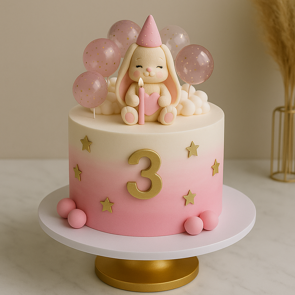 Ты только посмотри на эту милоту! Маленький зайчик в праздничном колпачке держит свечу и сердце — будто сам пришёл поздравить малышку. Градиентный переход от ванильного к розовому, воздушные облака, золотые звёздочки и цифра «3» делают этот торт настоящей сказкой на подставке. Он подойдёт как для торжества в кругу семьи, так и для праздника в детском саду. А ещё этот торт создан с расчётом на вау-эффект: дети будут в восторге, а родители — делать миллион фото.