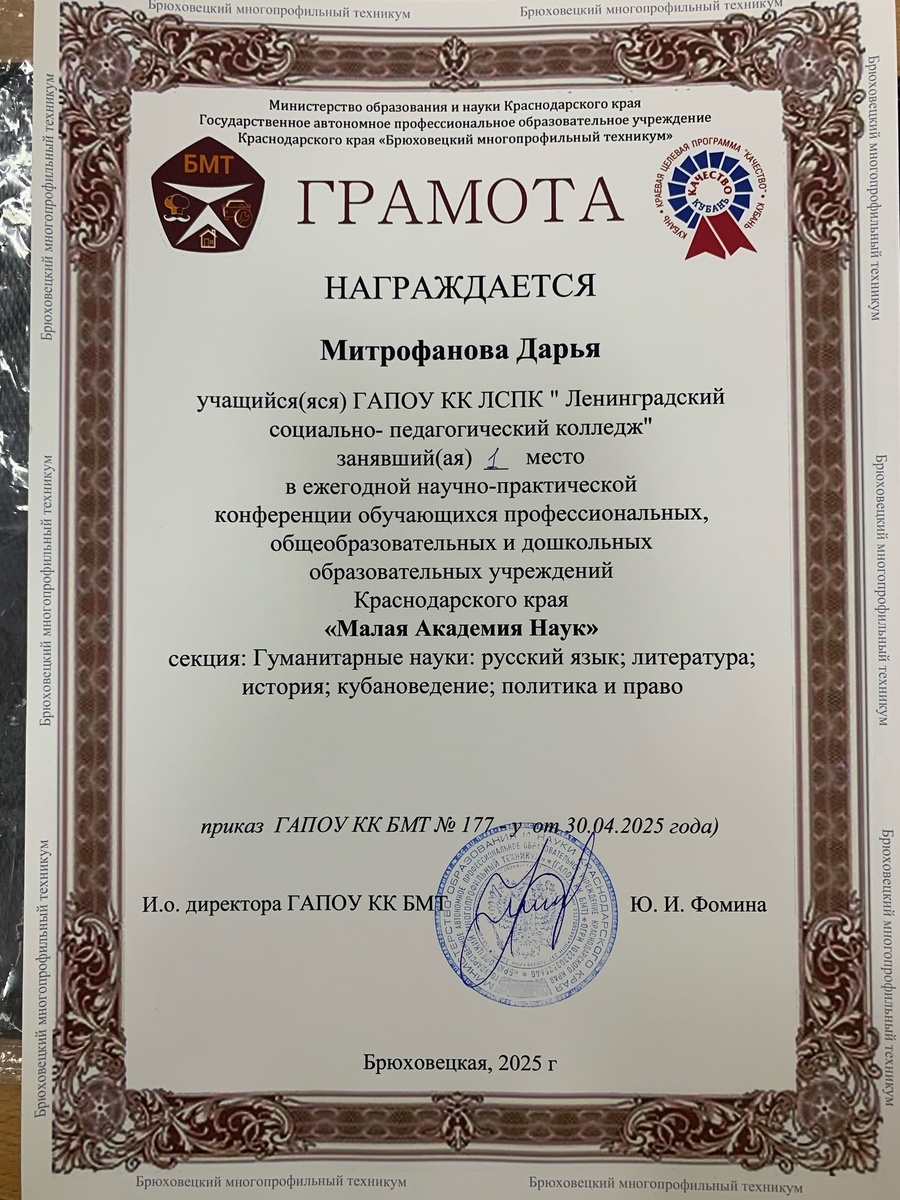 🏆 Победители научно-практической конференции «Малая академия наук» ✅ 5 мая студентки Митрофанова Дарья и Золина Кристина (группа Д2Вк, руководитель Стороженко Г.В.) приняли участие в ежегодной научно-практической конференции обучающихся профессиональных, общеобразовательных и дошкольных образовательных учреждений Краснодарского края «Малая академия наук». Конференции проводилась на базе Брюховецкого многопрофильного техникума. ✅Девушки представили проектную работу «Образование и культура станицы Уманской-Ленинградской: опыт исторической реконструкции средствами музейной педагогики». Выступление девушек по достоинству оценено членами жюри - Митрофанова Дарья и Золина Кристина заняли первое место в конференции!🎉🎉🎉
