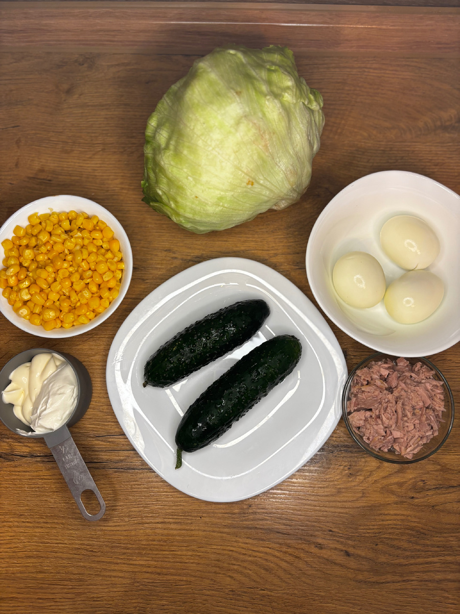 Салат с тунцом Всем привет! Это Оля) Сегодня хочу поделиться с вами салатом из тунца. Нам понадобился: Банка тунца в собственном соку Банка консервированной кукурузы Огурец 2 шт Яйца 3 шт Салат айсберг 1/4 качана Майонез 1 столовая ложка Сметана 1 столовая ложка Айсберг, отварные яйца и огурцы нарезаем кубиками. Отправляем все ингредиенты в салатник. Заправляем сметаной и майонезом (можно чем то одним), солим по вкусу и вуаля салат готов! Приятного аппетита 😋