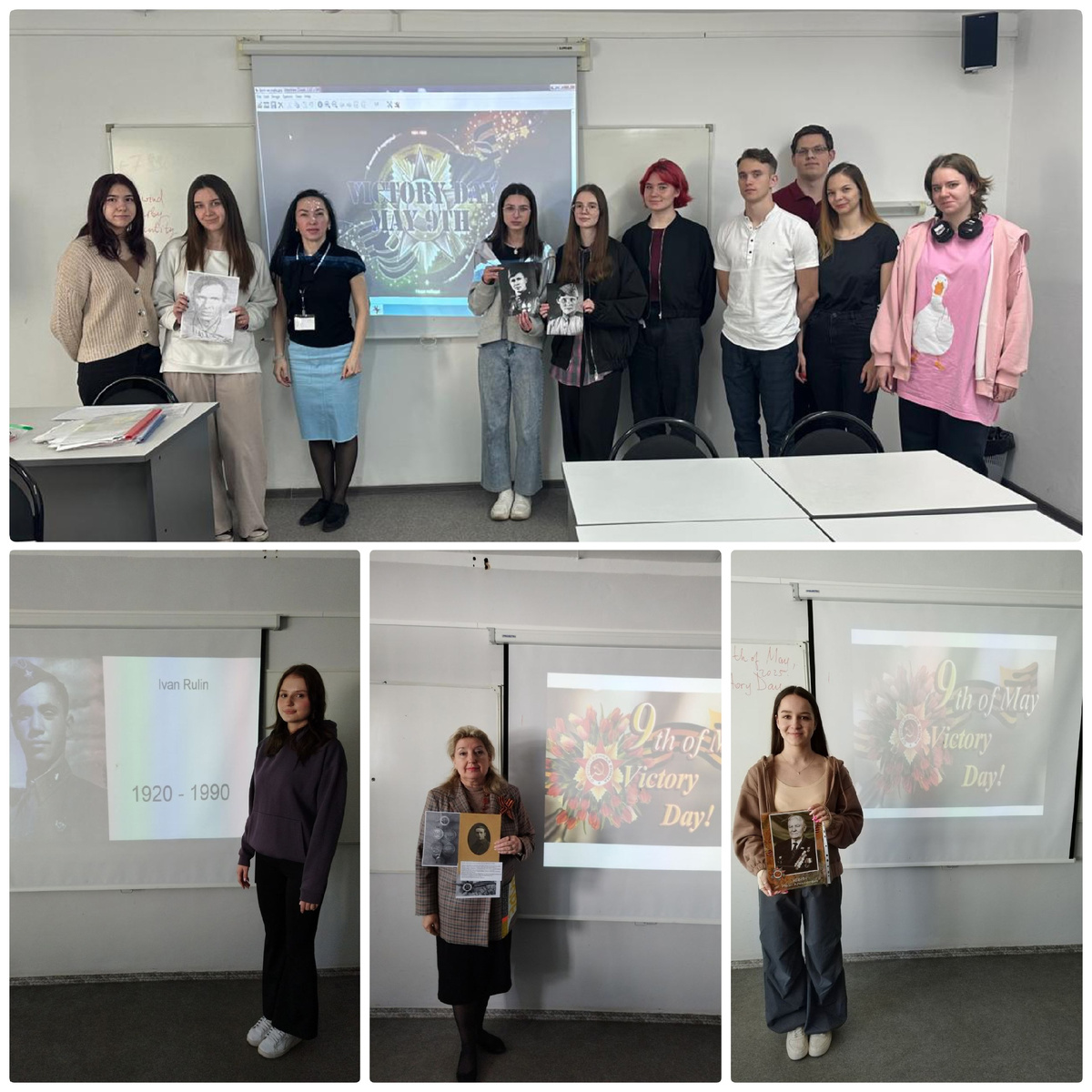 5 мая на кафедре иностранных языков Тольяттинской академии управления по-своему отметили предстоящий юбилей. Студенты второго курса подготовили информацию о своих прапрадедушках и прапрабабушках - участниках Великой Отечественной войны, переложили на английский язык и выступили с презентациями. Преподаватели Наталья Александровна Корнеева и Маргарита Руслановна Писарева дали ребятам достаточно времени, чтобы каждый мог глубоко погрузиться в историю своей семьи. И конечно, в ходе исследований было сделано немало открытий. Не только благодаря общению со старшими членами семьи, хранителями семейных историй и архивов: в помощь тем, кто увлекается генеалогией, сегодня немало интернет-ресурсов, по которым можно отследить боевой путь своего героя. А только представьте, каково узнать, что твой прапрадедушка за ратные подвиги получил медаль «За отвагу» или орден Красной Звезды, а то и множество боевых наград! К сожалению, не все они вернулись. Но остались фотографии, и практически каждый пришел