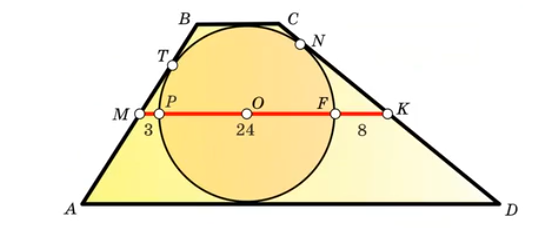Рассмотрим решение геометрической задачи, которая на канале Валерия Казакова решена возмутительно сложно. Проделано много вычислений, совсем не нужных для получения ответа. Задача дана под заголовком "Геометрия 9 класса в одной задаче!" Итак, задача. 1. В трапецию ABCD вписали окружность. Отрезок MK, параллельный основаниям трапеции, проходит через центр окружности и пересекает окружность в точках M и F. Известно, что MP = 3, PF = 24, FK = 8. Найдите площадь трапеции. Заключительный кадр решения выглядит так. Источник. Геометрия 9 класса в одной задаче! | Наглядная Геометрия | Дзен https://dzen.ru/video/watch/6819d834c72bc3133e988eb3 Валерий Казаков показал хорошее знание вопросов курса геометрии 9 класса, которые можно обсудить при решении задачи, только задача решается в два действия вместо семи. Решение. Так как MK — отрезок, параллельный основаниям трапеции и равноудалён от прямых, содержащих основания, то MK — средняя линия трапеции, MK = 3 + 24 + 8 = 35. Так как диаметр окружност