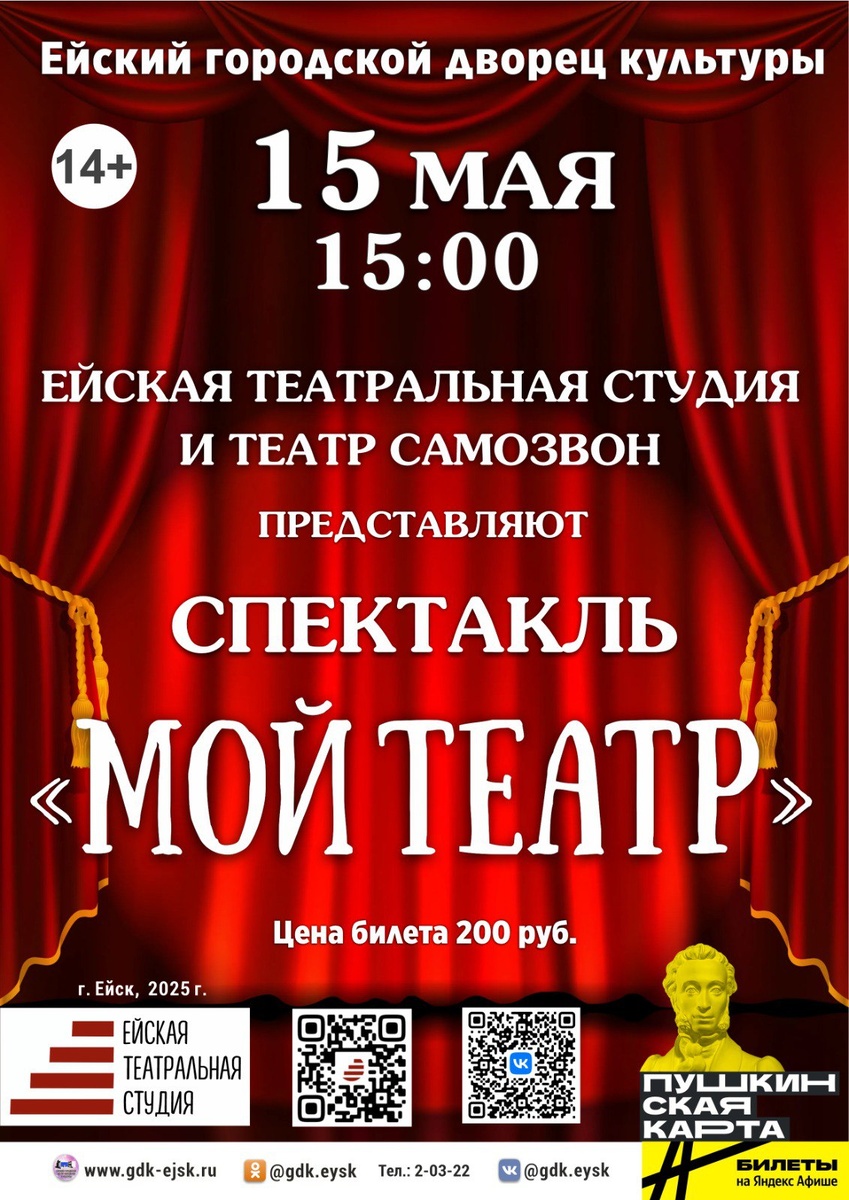 15 мая 15:00 Ейская театральная студия и театр «Самозвон» представляют спектакль «Мой театр» 🎭 Билеты можно приобрести в кассе по адресу: ул. Свердлова, 73/1, а также онлайн Цена: 200₽ Удивительное путешествие в мир театра глазами начинающих артистов. Здесь нет места скучным сюжетам – только искренние истории, рожденные в детских сердцах и воплощенные в живые миниатюры. ▫ Для тех, кто только открывает для себя мир театра, и для тех, кто уже делает первые шаги на сцене. Особенность постановки – все сценарии написаны самими участниками, а миниатюры для младших актеров созданы на основе их импровизаций. ▫ Взрослые увидят, как молодое поколение воспринимает театр и почему он остается актуальным в современном мире. ▫ Дети познакомятся с волшебным миром театра через понятные им истории и ситуации. Каждый найдет что-то своё: кто-то откроет для себя основы театрального искусства, а кто-то – новые грани творчества.