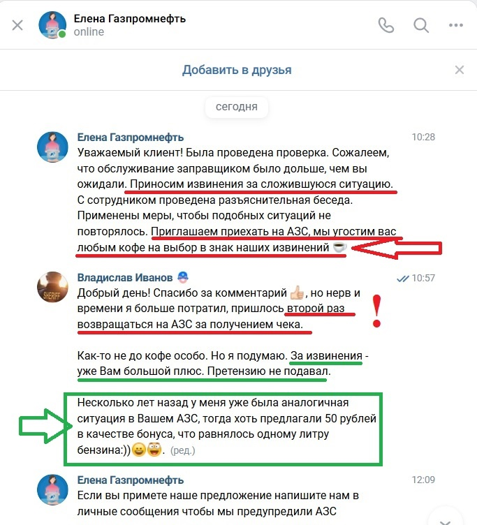 Сегодня, в личные сообщения в 10:28 мне написала представитель АЗС №2 "Газпромнефть" Елена комментарий следующего характера: