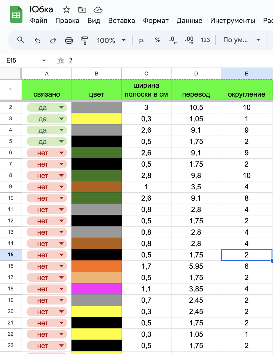 - 5 столбец - окончательное количество рядов . Пришлось редактировать , чтобы выйти на необходимое количество рядов по длине юбки